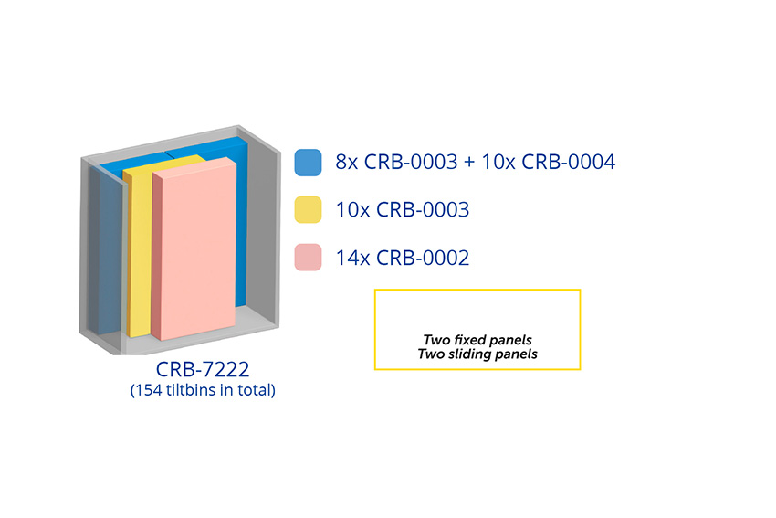 - Modules de bacs basculants intégrés par panneau coulissant : 10x CRB-0003 dans le premier panneau coulissant + 14x CRB-0002 dans le deuxième panneau coulissant