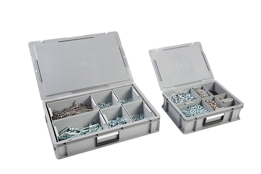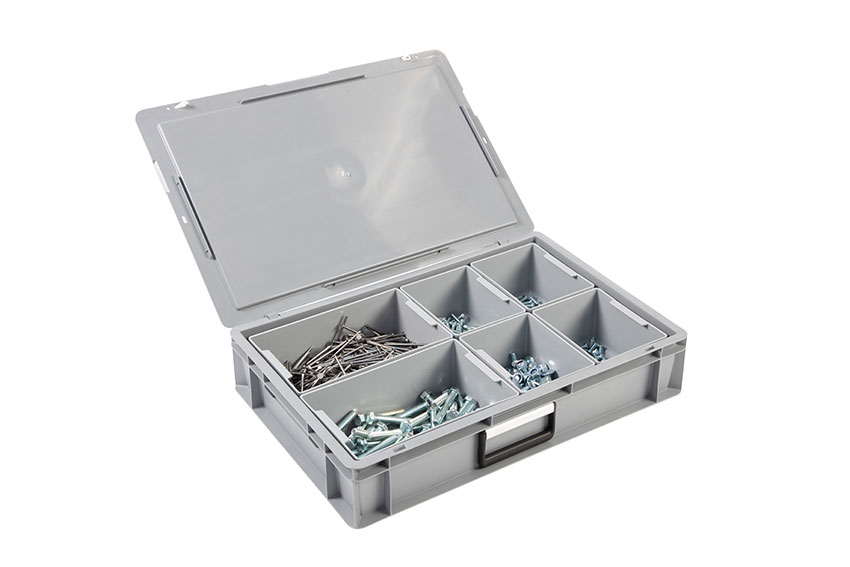 - Coiffre Euro avec couvercle sur charnière, 2 clips de fermeture et poignée basculante ergonomique